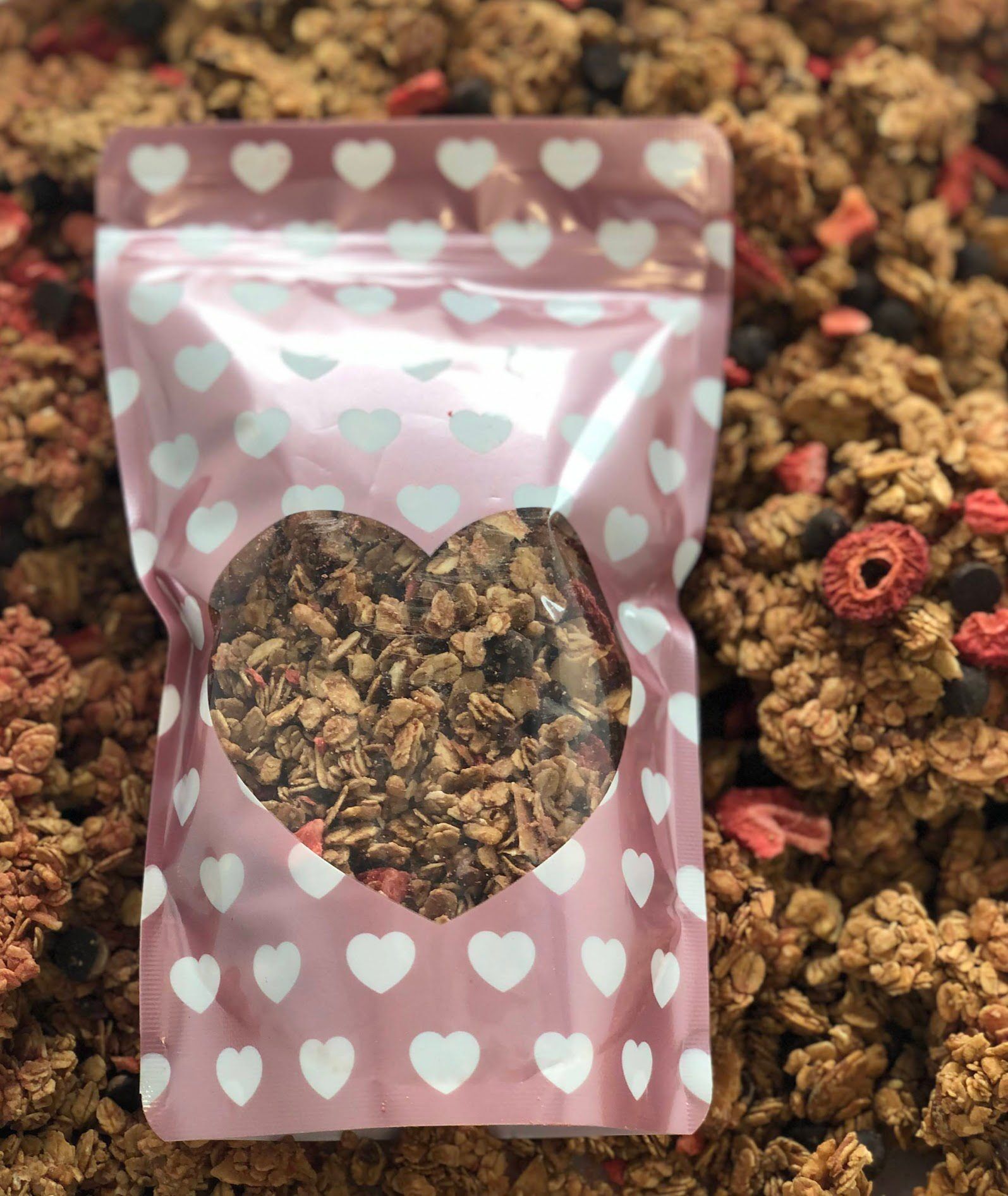 This cute little bag is full of so much love and it hasn’t even been gifted to your gal or pal yet! We made our Cocoa Crunch Granola VEGAN by using local maple syrup as a sweetener! We then added dairy free chocolate chips (dairy fans – you can’t tell the difference!) and crushed strawberries and oh my goodness is this delicious! Forget the box of chocolates and chocolate covered strawberries, this is the sweet treat you need!